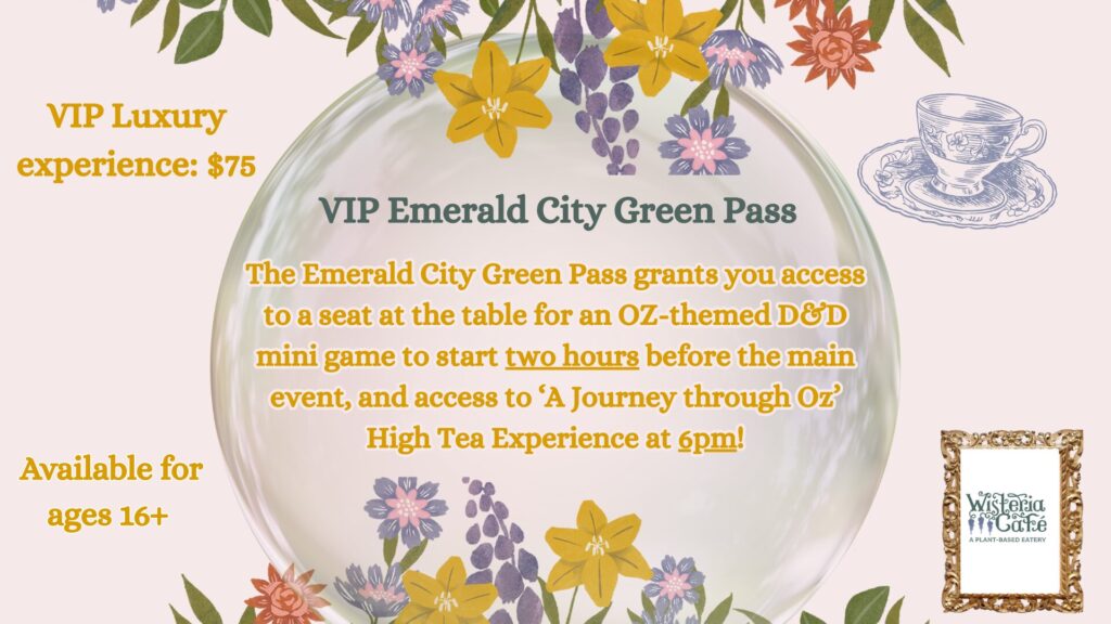 Are you ready to embark on a magical journey through Oz? In addition to the high tea experience, join us for a mini-tabletop roleplay experience! Join us two hours before the main event for an adventure led by Oz’s very own wonderful wizard!